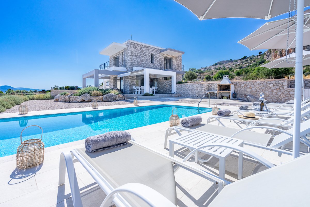 Die Red Rock Villa – ein luxuriöser 180 m² großer Rückzugsort auf der atemberaubenden Insel Rhodos. Diese moderne Villa bietet den perfekten Urlaubsort für Familien oder Gruppen von Freunden und verfügt über vier geräumige Schlafzimmer, einen privaten Infinity-Pool und einen Außengrill für Mahlzeiten im Freien.